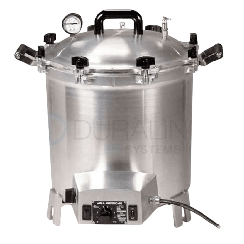 The All-American 75X is a rugged 41-quart (39L) electric steam sterilizer with a large 15¼” diameter chamber. Built with heavy-duty cast aluminum, it features automatic thermostatic control and a powerful 1650W heating element for fast, reliable sterilization. Ideal for laboratories, mushroom cultivation, veterinary use, and small clinics.